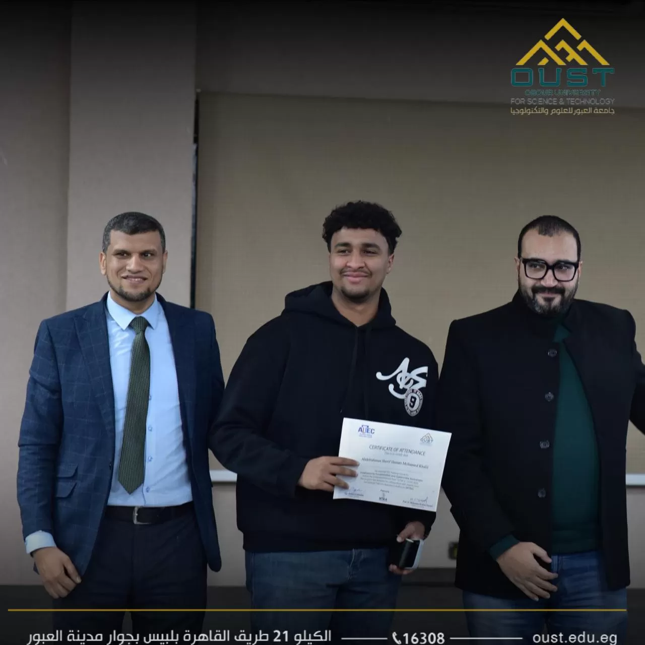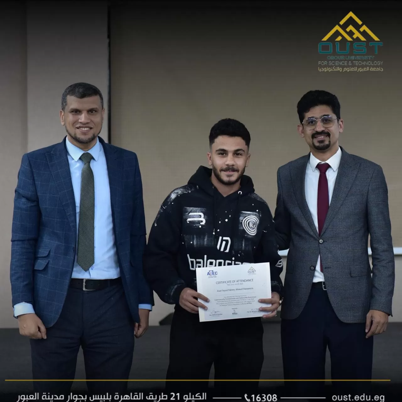 OUST concluded the activities of the Cybersecurity Course with two significant lectures on its final day. Eng. Mohamed El-Sobky delivered a lecture entitled “Key Regulatory Frameworks in the Field of Cybersecurity,” reviewing the most prominent policies and legislations governing the sector. Meanwhile, Dr. Mohamed El-Sayed presented “Applications of the Most Significant Emerging Crimes in the Context of Technological Advancement,” highlighting the legal challenges associated with digital transformation and the rapid acceleration of technologies. At the close of the training program, certificates of attendance were awarded to students in recognition of their active participation, and the lecturers were honored in appreciation of their academic efforts and distinguished contributions to the success of the course.