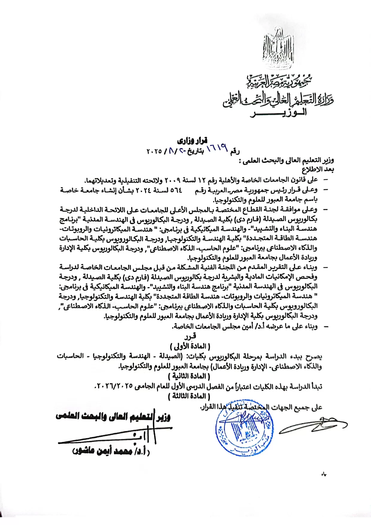 Obour University for Science & Technology (OUST) is pleased to announce the issuance of Ministerial Decree No. 1619 dated 20/8/2025, approving the commencement of studies for the first academic semester of the 2025/2026 academic year.